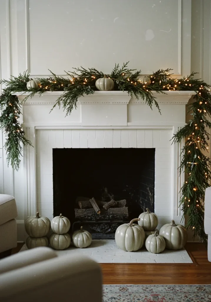 Soft fairy lights, lush cedar garlands, and pale gray pumpkins bring a serene, wintery twist to this Thanksgiving mantel. The combination of greenery and twinkle lights makes the white fireplace glow beautifully, adding just enough sparkle without losing its simple charm. The arrangement feels festive yet calm, with a hint of early Christmas magic.