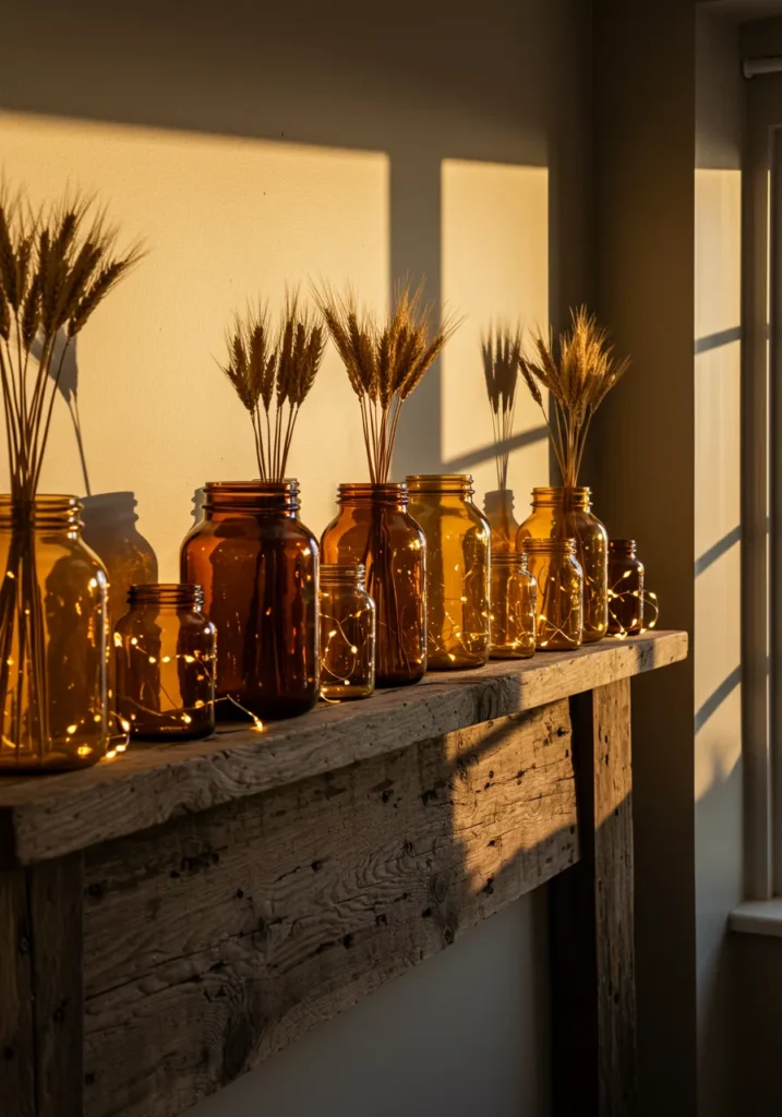 A row of amber glass jars filled with wheat stalks and tiny string lights gives this rustic mantel a golden radiance. The rough wooden beam adds beautiful texture, and the warm sunlight pouring in makes the jars shimmer like honey. It’s minimalist but still full of warmth, proving that simple touches can make a big impact.
