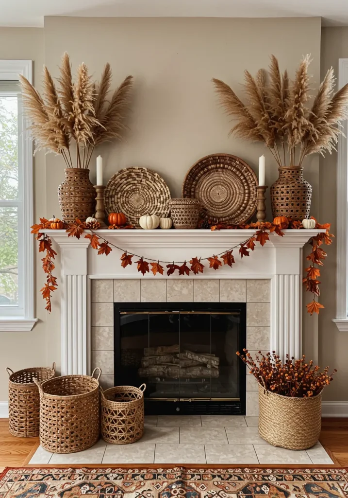 A mix of woven baskets, pampas grass, and tiny pumpkins gives this fireplace a beautiful boho personality. The earthy tones and layered textures feel warm and organic, while the garland of orange leaves ties it all together with a festive touch. Every element feels handcrafted and balanced, creating a relaxed fall atmosphere.