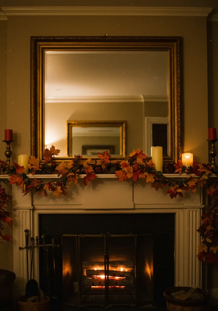 Golden light, soft candles, and a garland of fiery maple leaves wrap this mantel in classic Thanksgiving charm. The mirror above reflects the cozy flicker of candlelight, creating double the warmth and sparkle. Deep reds, burnt oranges, and soft yellows make this design feel like a perfect autumn evening.