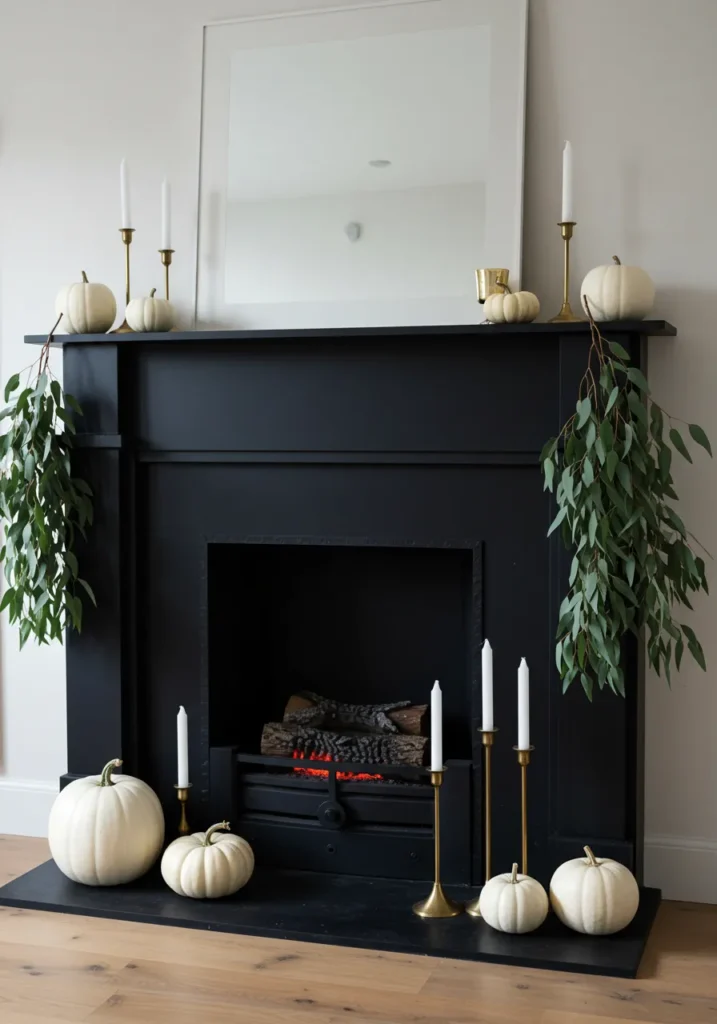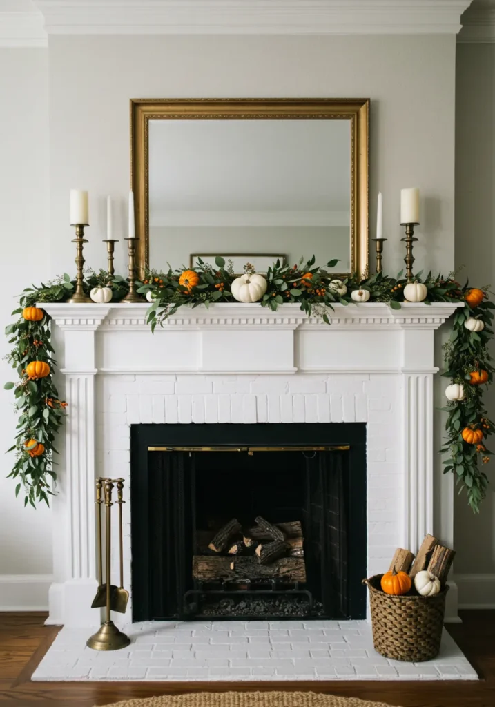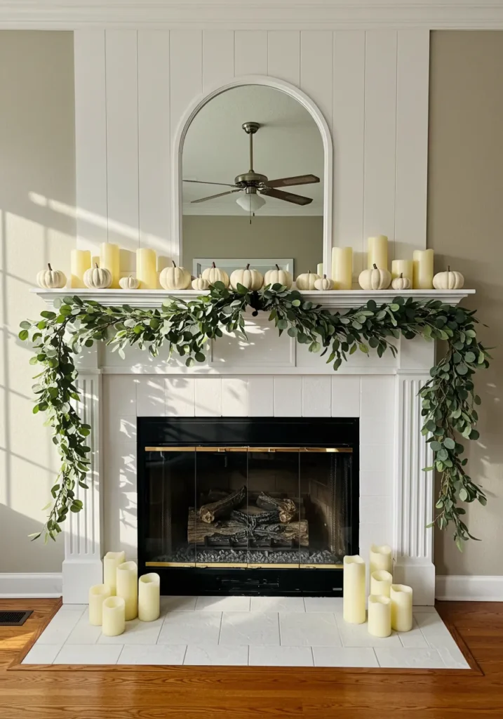 This design is all about clean lines and calm elegance. A white mantel paired with lush green eucalyptus garlands and small white pumpkins gives a modern twist to traditional fall decor. Creamy candles in varying heights add that soft golden glow that feels so relaxing.