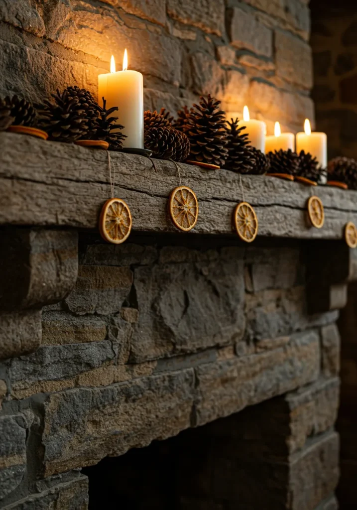 What I love about this setup is how it embraces simplicity. The natural materials do all the talking, and the soft candlelight creates a calm, welcoming mood. It’s the kind of mantel that makes you want to curl up with a blanket and a cup of tea while the scent of pine and citrus fills the room.