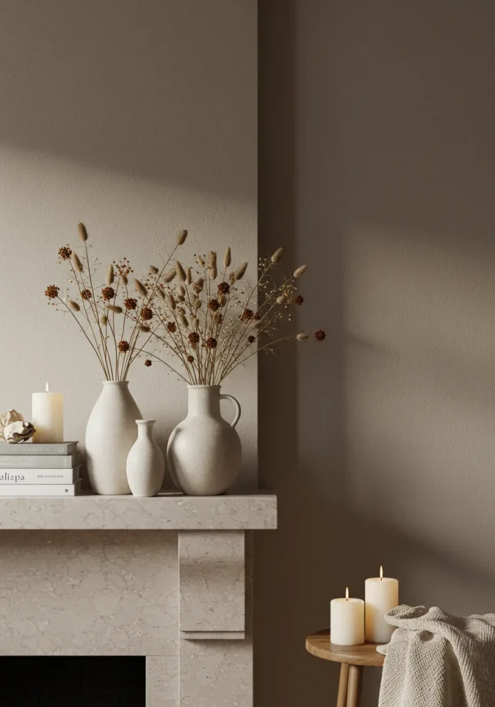 This mantel is all about understated elegance. The soft beige tones, smooth ceramic vases, and dried stems create a quiet balance that feels both modern and warm. The neutral palette keeps the space light and calming, while the gentle candlelight adds a soft golden touch that ties it all together beautifully.