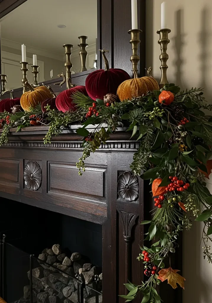 Elegant Mantel with Velvet Pumpkins