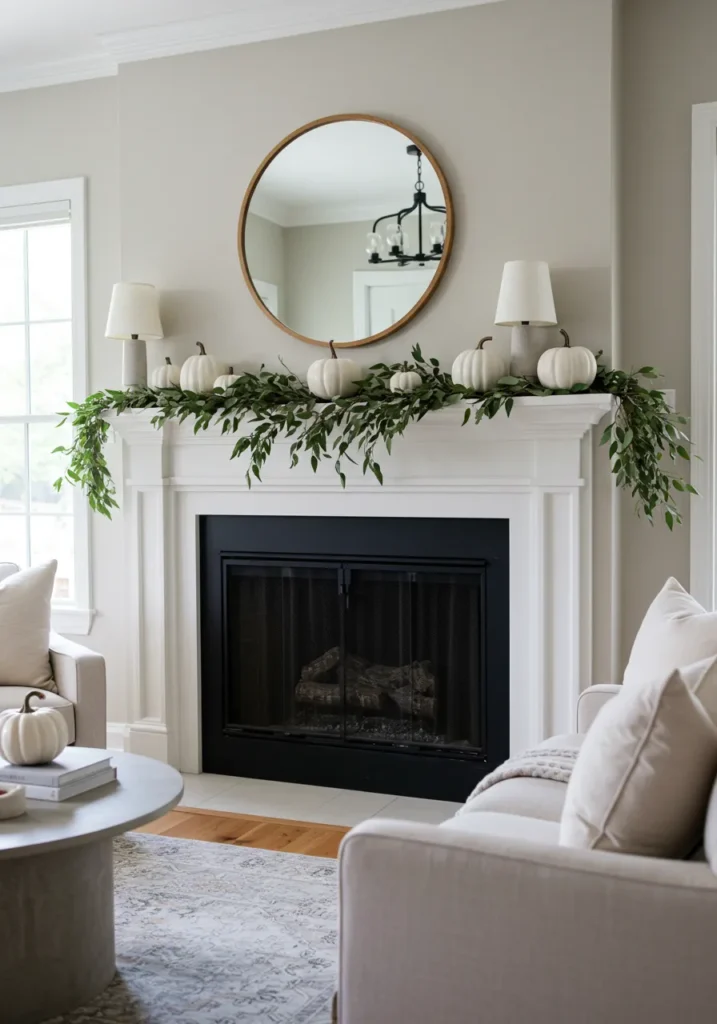 This design proves that simplicity can be stunning. Crisp white pumpkins sit atop a classic white mantel, paired with cascading greenery for a touch of natural beauty. The round mirror and soft lighting add to the airy feel, making the entire room glow with warmth and calm.