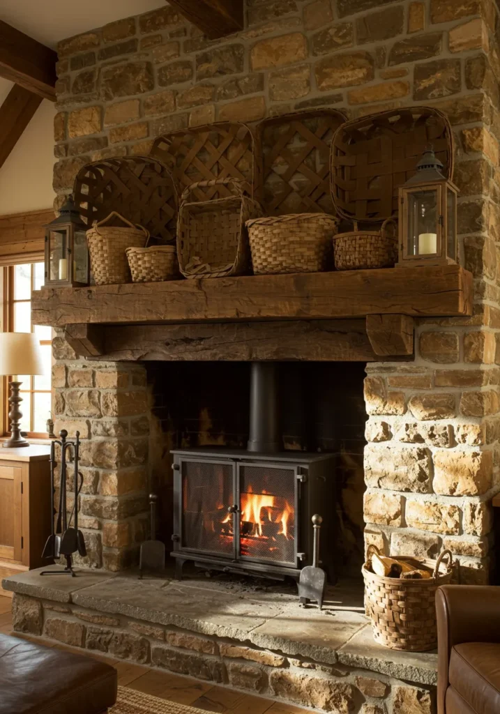This stone fireplace gives off major cabin-in-the-woods energy. The rugged stonework and chunky wooden beam set the tone for a space that feels rustic and lived-in. A collection of woven baskets adds warmth and texture, while the lanterns on each end balance the look with soft candlelight. It’s simple but rich in character, the kind of mantel that looks best when the fire’s glowing and there’s a chill outside.