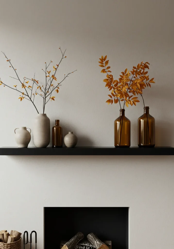 This minimalist setup captures fall in the most subtle way. The black floating mantel is styled with matte ceramic vases and amber bottles holding delicate branches with golden leaves. Every detail feels intentional and serene, blending modern design with organic beauty.