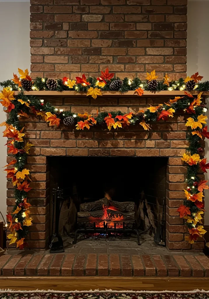 A classic brick fireplace becomes the star of the room with this bold and cheerful garland. Vibrant autumn leaves, pinecones, and twinkle lights wrap around the mantel, bringing instant seasonal charm. The glowing fire beneath adds the perfect cozy finishing touch.