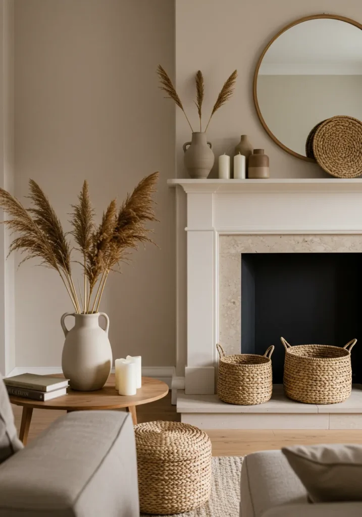 Neutral Mantel With Woven Accents and Pampas Grass