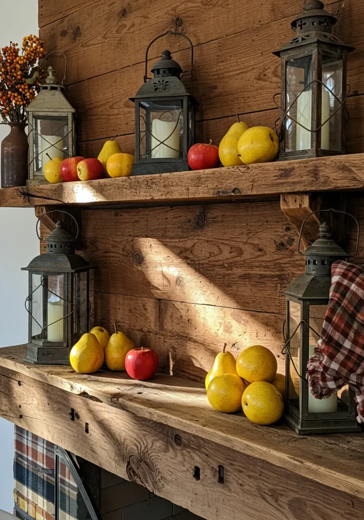 This cozy mantel captures that perfect countryside warmth with its mix of rough reclaimed wood, rustic lanterns, and simple seasonal fruit. The wood grain brings so much texture, while the apples and pears add cheerful pops of red and yellow that feel naturally festive. Each candle lantern casts a soft glow that makes the whole setup feel straight out of a farmhouse kitchen on a crisp November morning.
