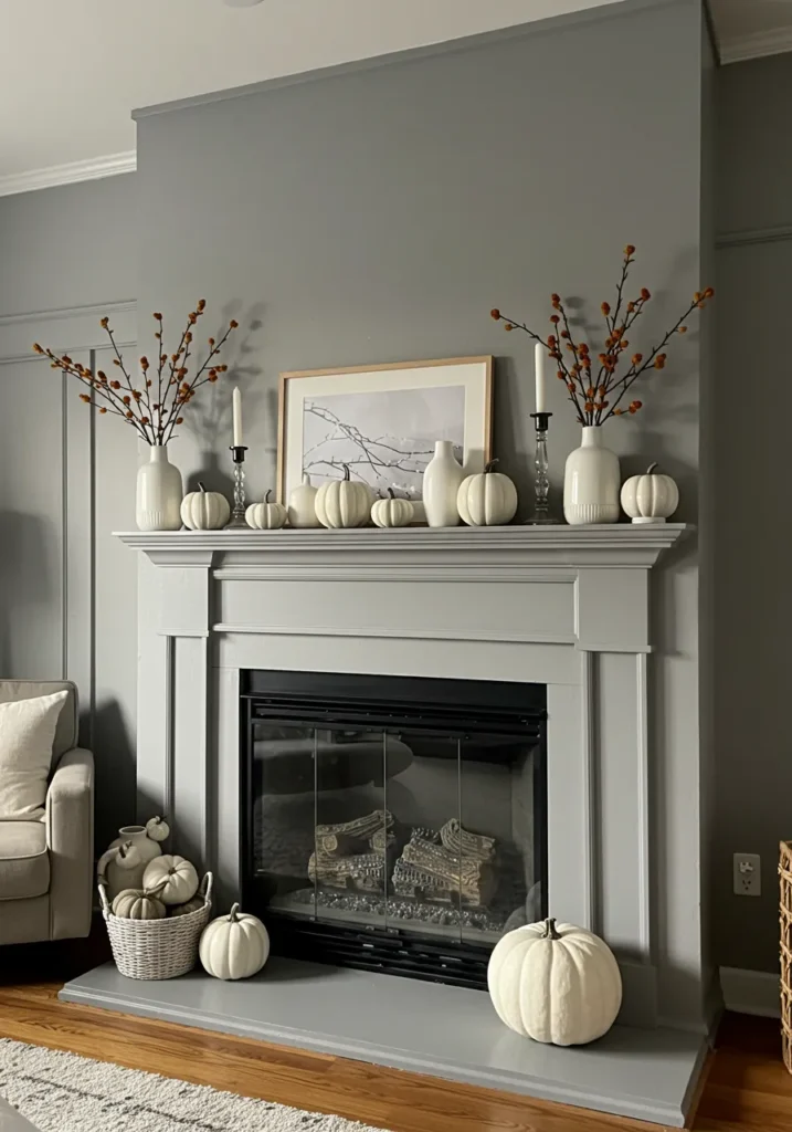This soft gray fireplace design is the definition of understated sophistication. A collection of white pumpkins, sleek ceramic vases, and delicate autumn branches come together to create a balanced, modern display. The monochrome color palette feels calm and polished, while the touches of warm wood and soft orange berries bring just enough coziness to keep it from feeling cold.