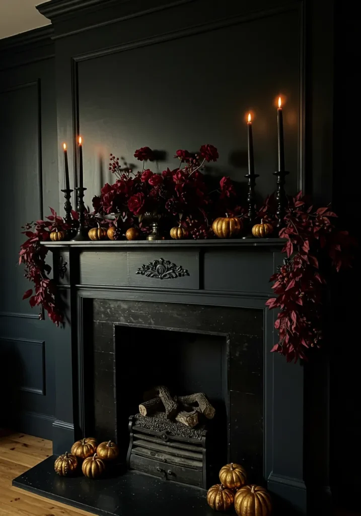 This moody fireplace setup pairs black walls with rich burgundy foliage, matte black candlesticks, and gold-toned pumpkins for a bold, elegant statement. The deep tones add instant warmth, while the flickering candlelight softens the dramatic contrast. Every detail feels intentional, from the layered textures to the lush arrangement of fall leaves that spill naturally over the mantel’s edge.