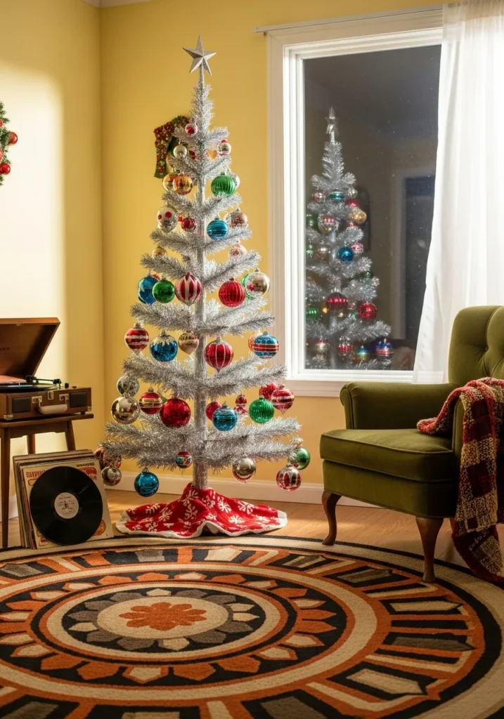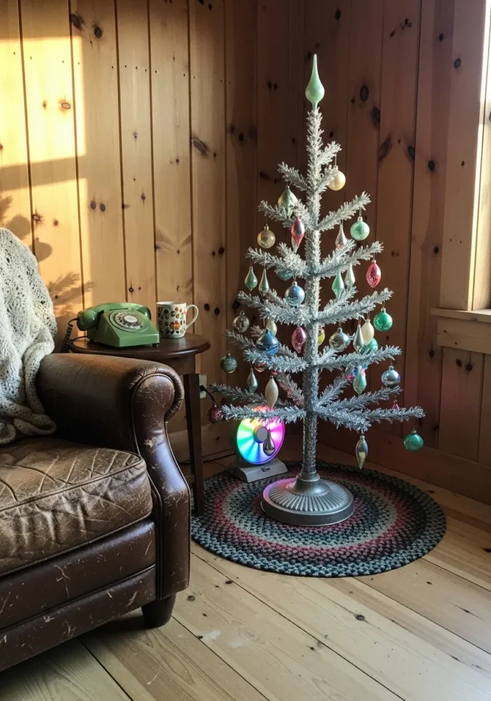 This vintage setup feels like a charming time capsule. The white tinsel tree, trimmed with pastel ornaments, glows softly beside a weathered leather chair and a mint-green rotary phone. The wooden walls and braided rug add to that homey 1960s warmth, making the whole corner feel like a sweet memory you can step into.