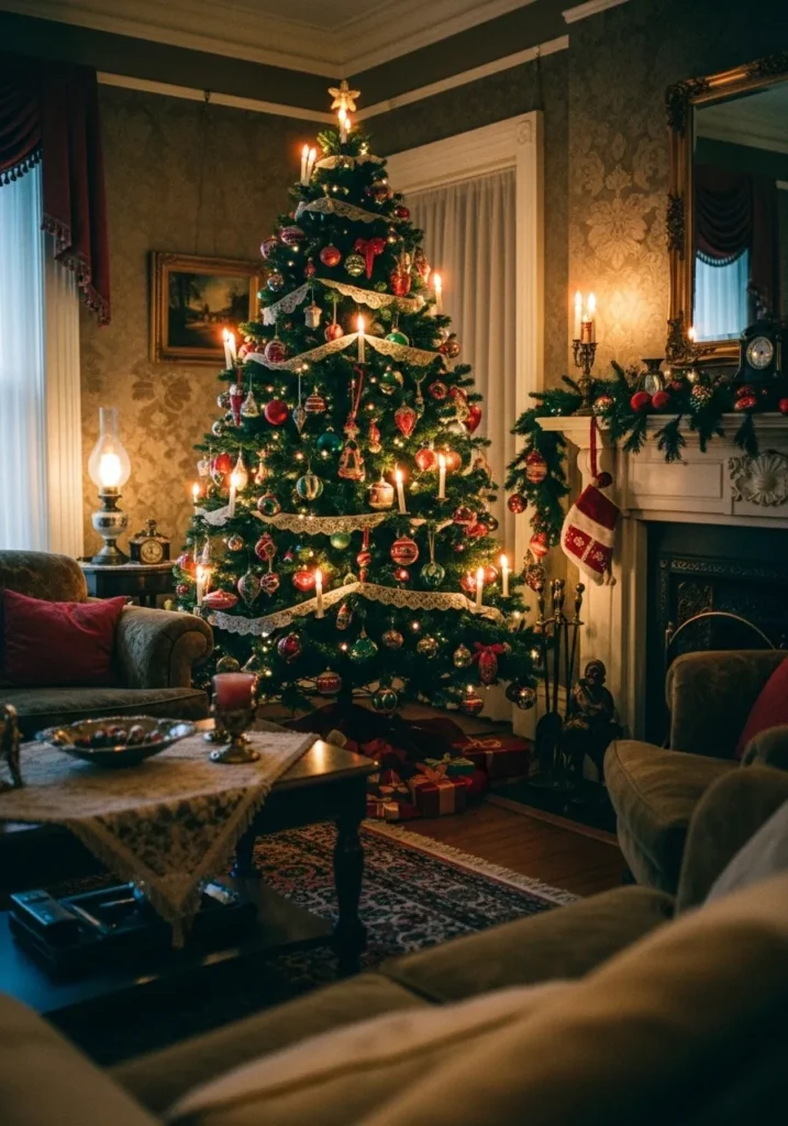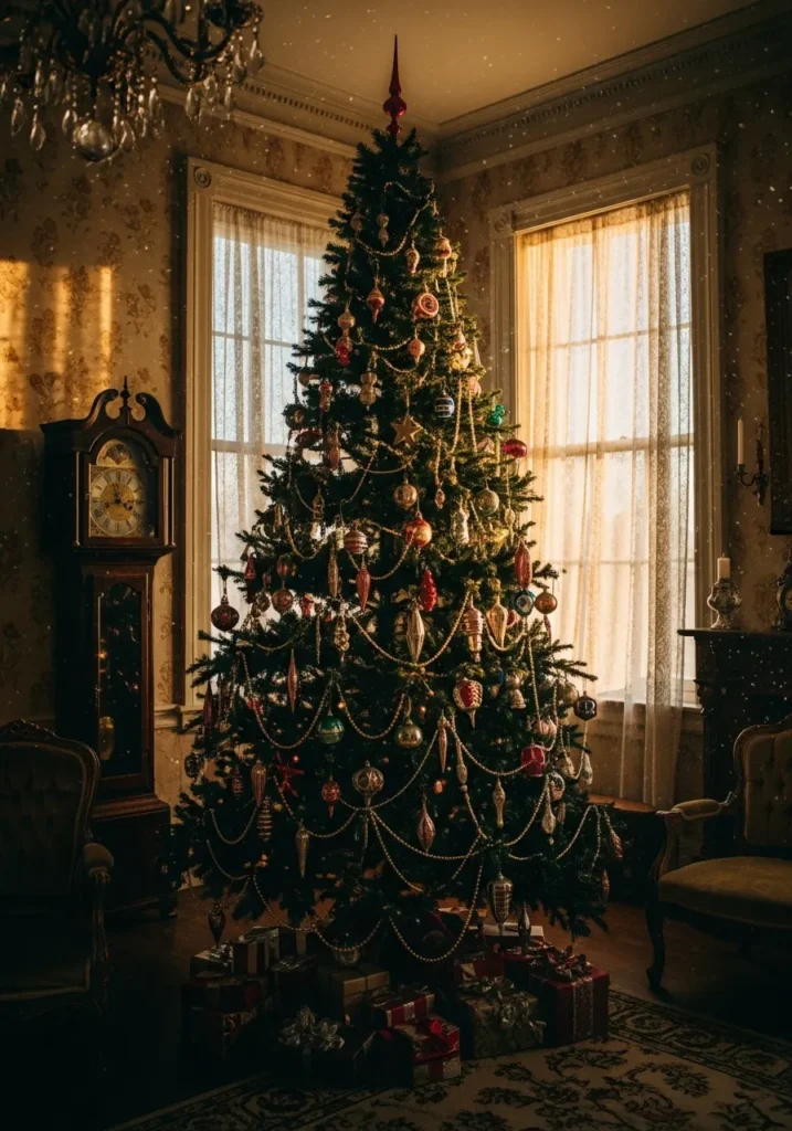 This elegant tree stands tall and graceful in a room filled with antique details. Strings of golden beads and delicate vintage ornaments shimmer in the soft afternoon light. The lace curtains, grandfather clock, and aged wallpaper add to that rich, historical atmosphere that feels both cozy and grand.