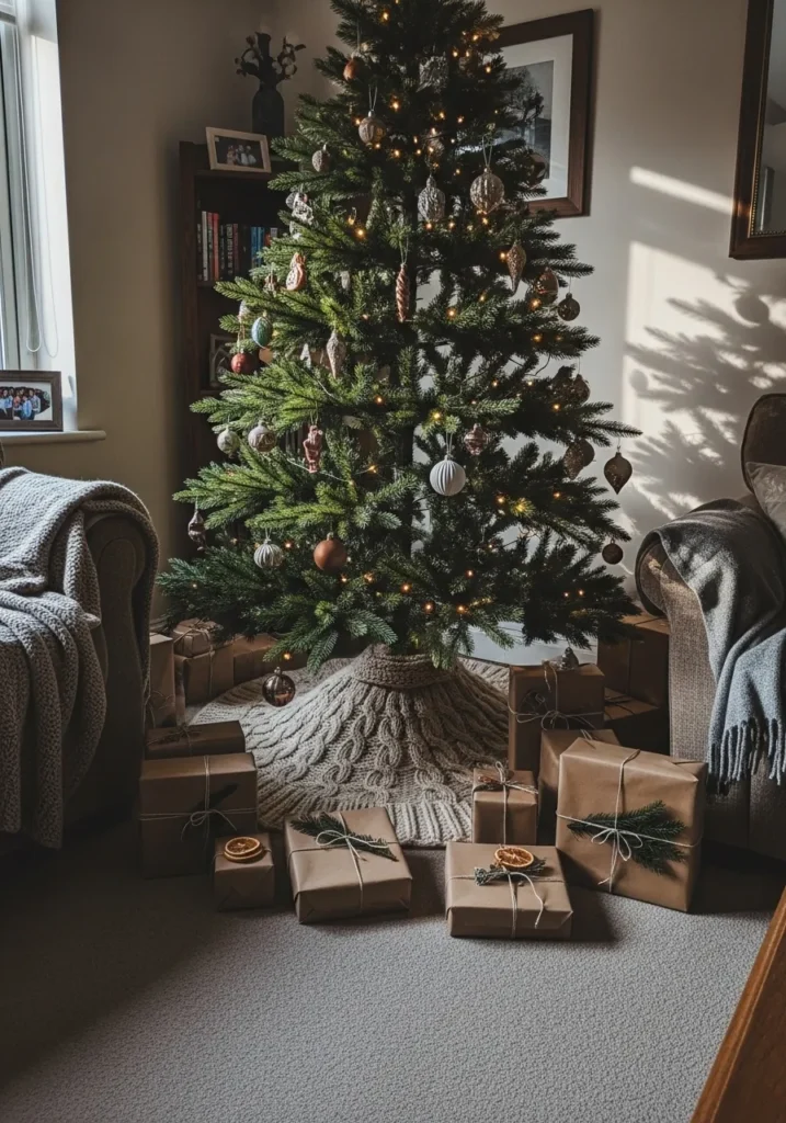 This Christmas tree proves that understated can still be stunning. Decorated with neutral ornaments and surrounded by simple kraft-wrapped gifts, it has a natural, grounded charm. The knitted tree skirt and soft lighting make it feel warm and effortless.