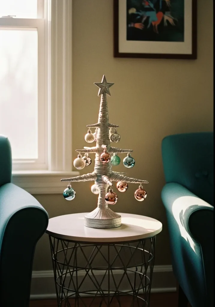 This little metallic tree could fit right on a retro side table and still steal the show. Its pastel ornaments shimmer gently in the sunlight while the clean lines and teal chairs add that classic mid-century modern feel. The look is simple, chic, and perfectly nostalgic.