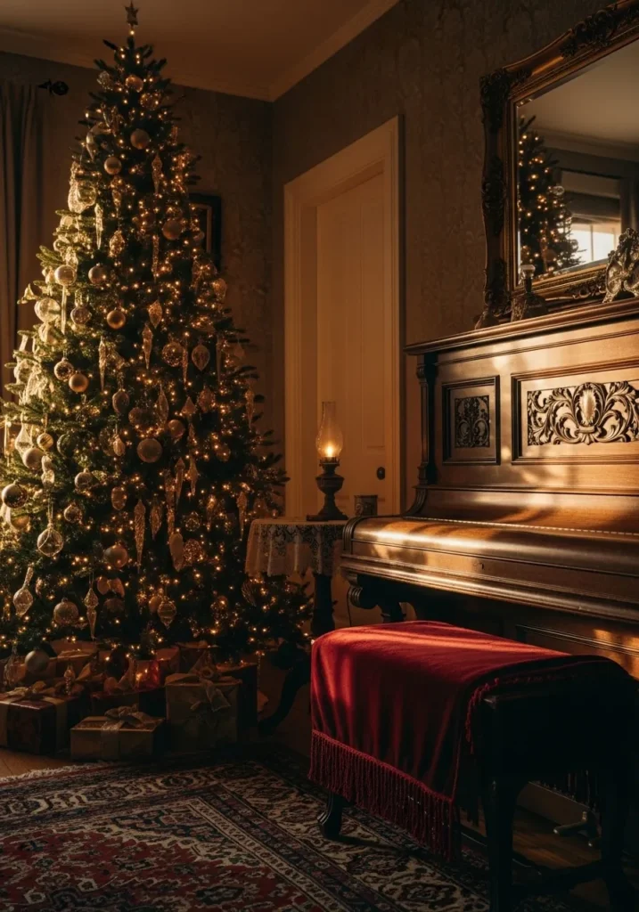 Here’s a Christmas tree that feels straight out of a classic holiday film. The golden lights and shimmering ornaments reflect off a beautifully carved piano, with a deep red throw adding a touch of drama. Everything about the room whispers elegance and warmth.