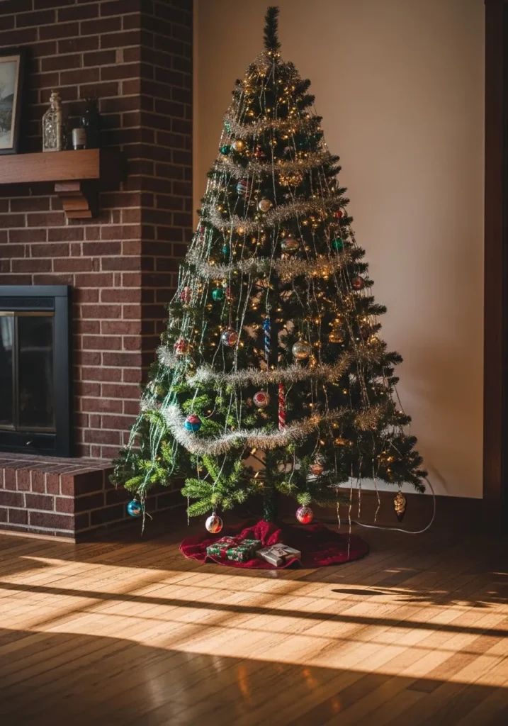This tree brings back everything wonderful about old-fashioned Christmas mornings. The silver tinsel catches the light beautifully, while colorful baubles hang in that slightly imperfect, perfectly charming way. The brick fireplace and wood floors create a cozy vintage backdrop that feels just right.
