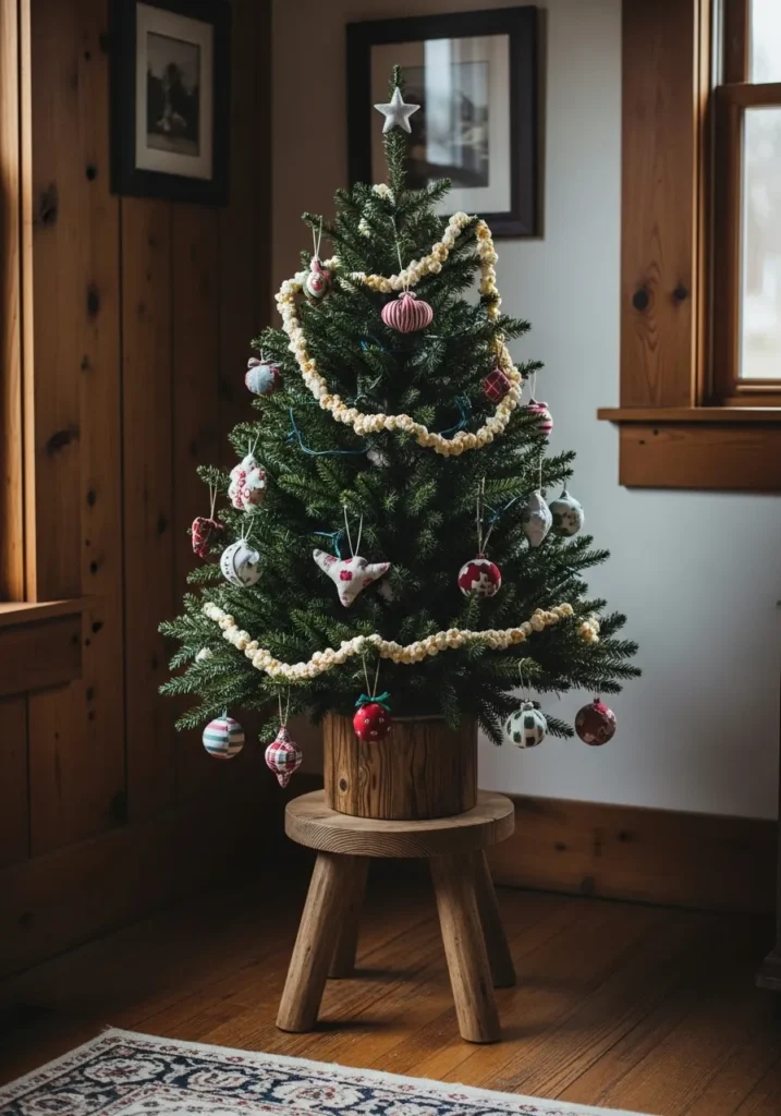 Here’s a Christmas tree that feels straight from the heart. The small pine sits proudly on a rustic wooden stool, wrapped in a cheerful popcorn garland and dotted with homespun fabric ornaments. The simple wood-paneled walls make every detail pop with cozy country charm.