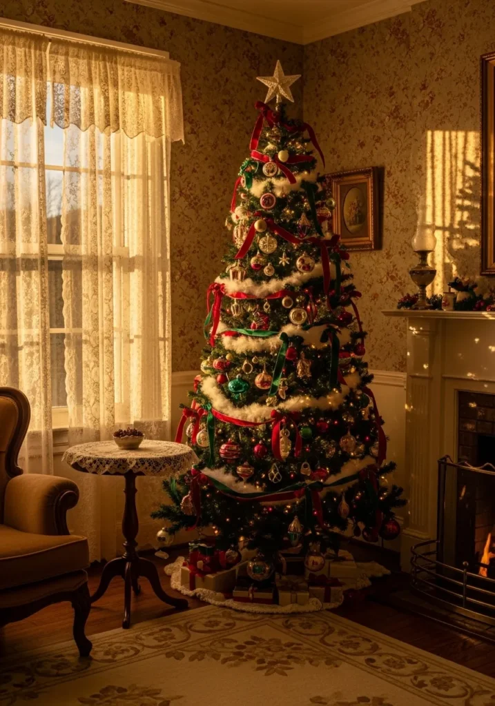 This tree is pure Christmas nostalgia. With strands of white garland, bold red ribbons, and classic glass baubles, it glimmers under the warm light of sunset. The lace curtains and antique furniture complete that perfectly nostalgic mood that feels straight out of a golden-era movie.