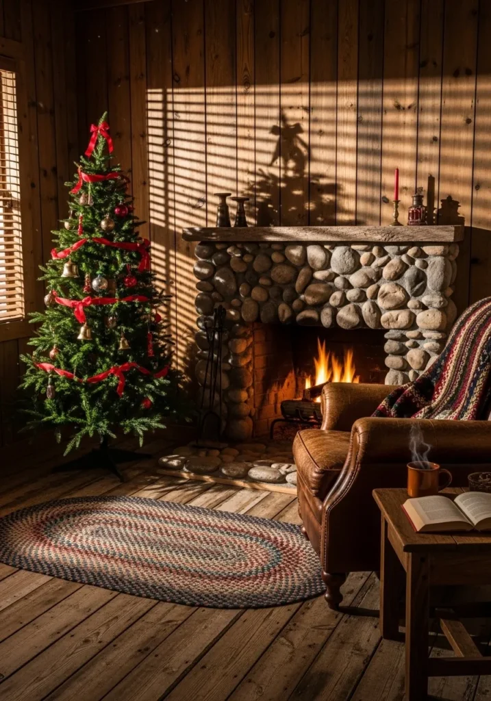 This scene feels like Christmas in a mountain cabin. A simple green tree wrapped in red ribbons stands proudly beside a stone fireplace, where a crackling fire casts dancing shadows on the wood-paneled walls. The mix of textures—stone, wood, leather—creates a comforting, earthy balance.