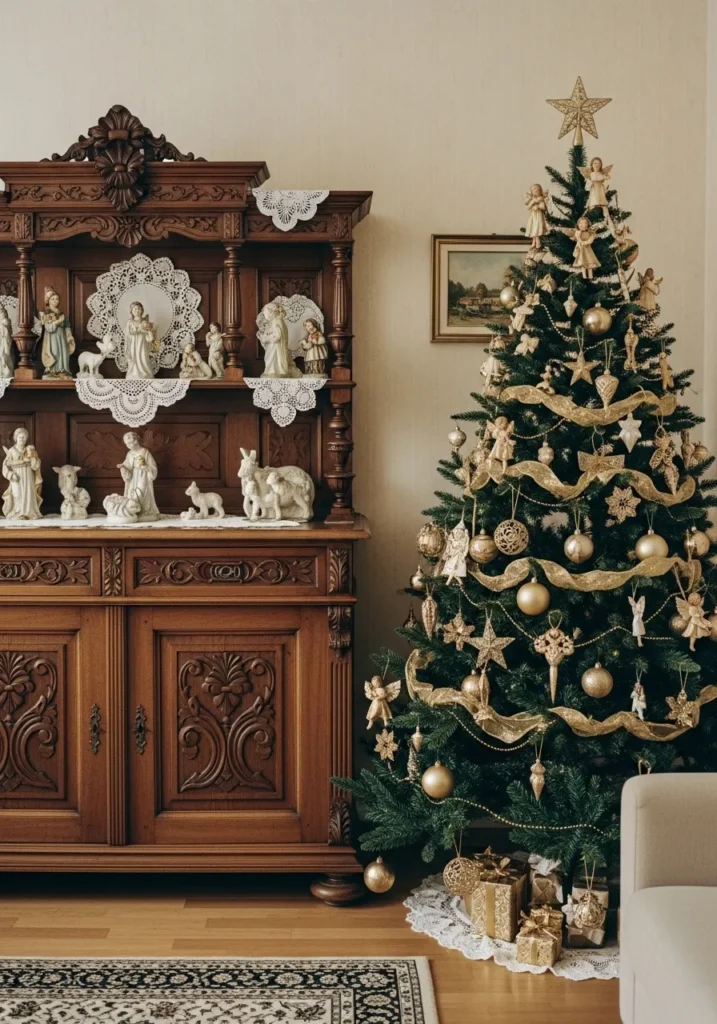 This tree gleams with elegance beside an ornate wooden cabinet filled with porcelain figures. The golden ornaments, ribbons, and bows tie everything together, giving the space an air of old-world sophistication. The lace doilies and carved wood details whisper stories of Christmases long ago.