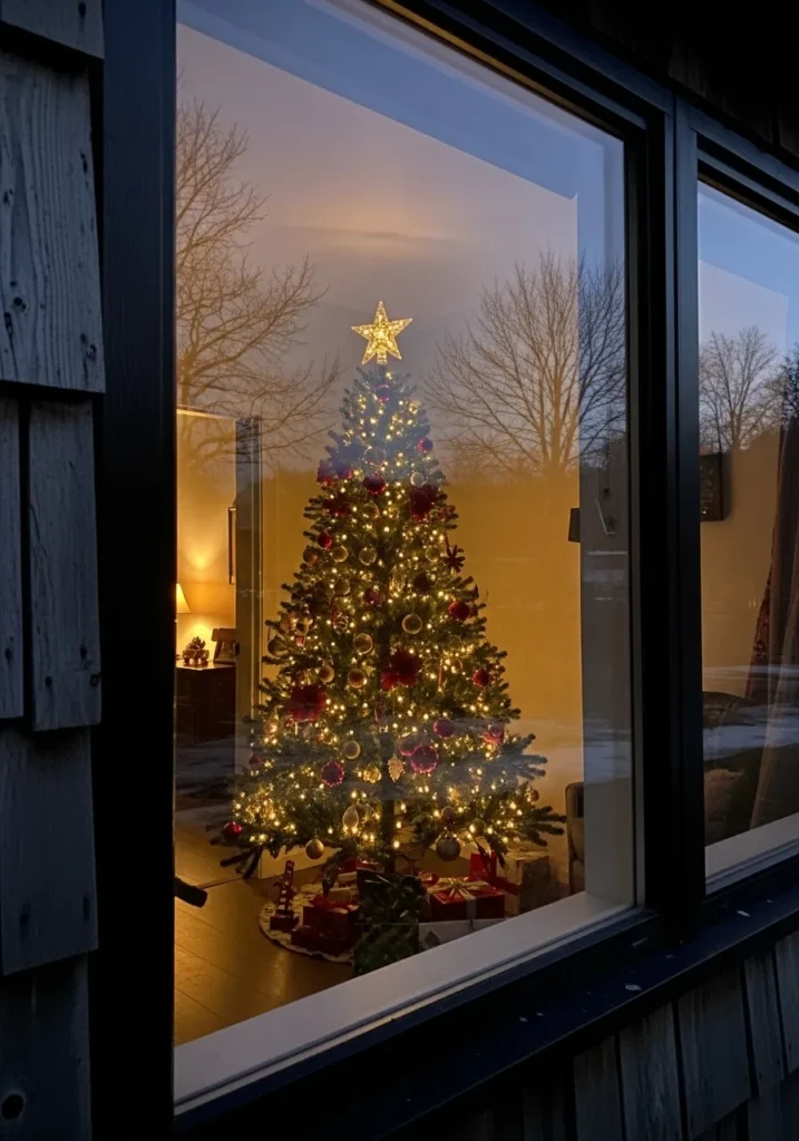 There’s something so magical about seeing a Christmas tree from outside. This one sparkles in the twilight, its lights reflecting softly in the glass. The star on top shines bright, framed by the dark blue of evening and the quiet outline of bare trees beyond.