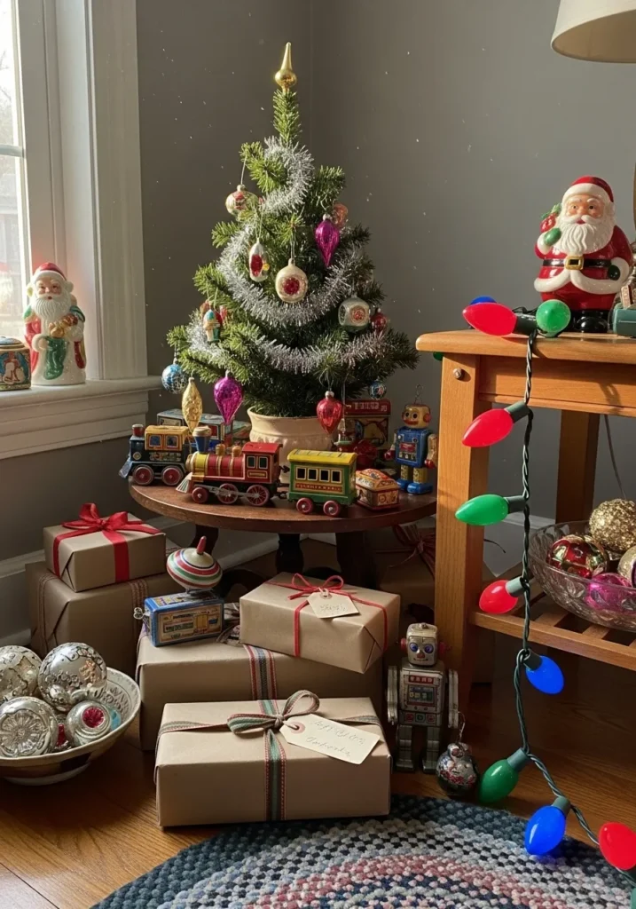 This tiny Christmas tree feels straight out of a childhood memory. It’s surrounded by classic tin toys, a colorful train circling its base, and shiny glass ornaments that catch the sunlight just right. The paper-wrapped gifts tied with string and the cheerful vintage Santas add to the playful, old-fashioned magic.
