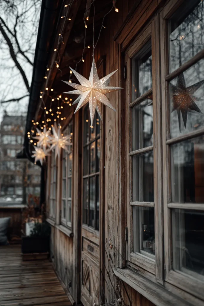 This charming rustic home turns simple wooden windows into a magical Christmas scene. Delicate star lanterns hang from the eaves, softly glowing against the weathered wood siding. Twinkle lights add a gentle sparkle that reflects in the glass panes, creating a cozy, golden shimmer as daylight fades. The mix of natural textures and warm light gives this space such a relaxed, Scandinavian-inspired holiday feel.