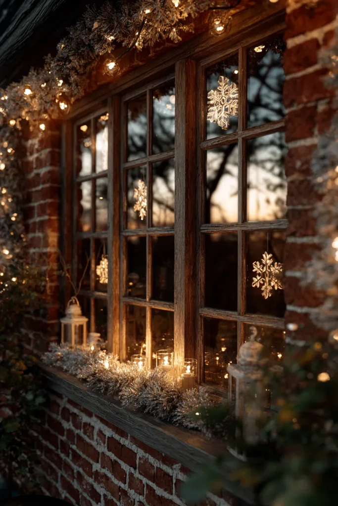This cozy window display brings timeless warmth to a rustic brick home. Frosted garlands shimmer along the windowsill, catching the soft glow of string lights and tiny candles that flicker behind the glass. Hanging snowflake ornaments add a gentle winter sparkle, reflecting the golden light that spills out from inside. The mix of natural wood frames, textured brick, and silvery accents creates that perfect in-between of vintage charm and festive magic.