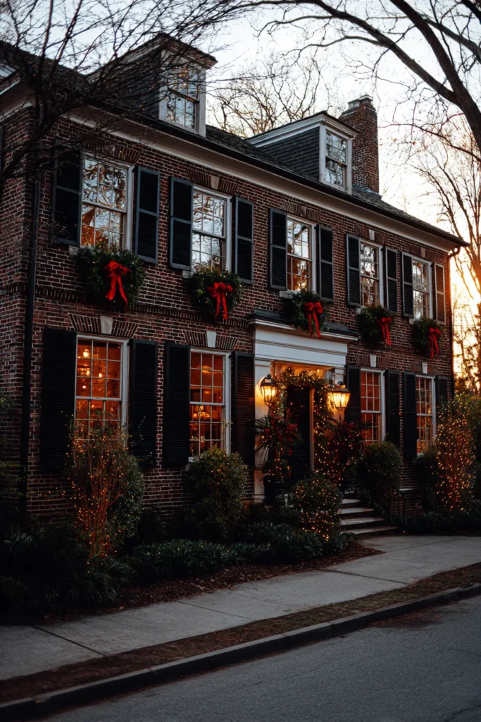 I can’t help but fall in love with this kind of traditional charm. The red ribbons against the brick are such a simple touch, yet they make such a big impact. There’s something so comforting about seeing those glowing windows at dusk—it feels like a promise of cozy evenings, festive laughter, and a little bit of holiday nostalgia.
