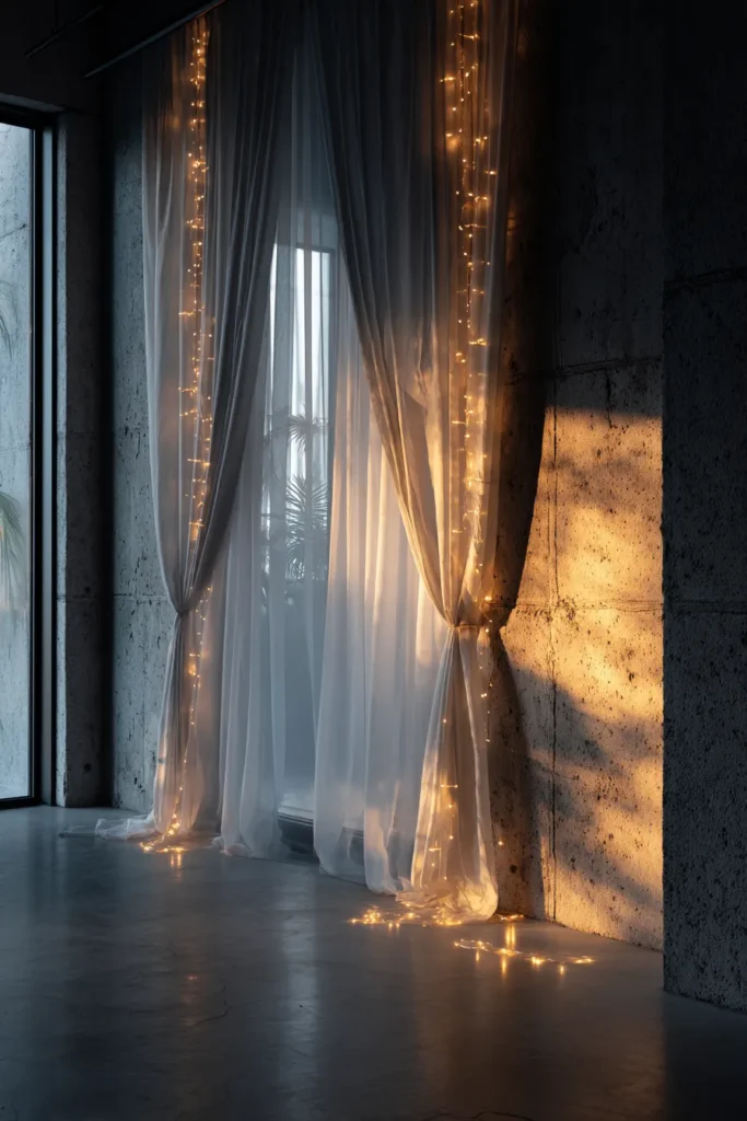 This softly lit window setup brings pure elegance through simplicity. Sheer white curtains fall gracefully from ceiling to floor, letting the warm string lights peek through like delicate strands of starlight. The gentle glow bounces off the textured gray wall, creating a cozy golden hue that feels calm and effortless. It’s a minimal yet romantic take on Christmas decor that looks just as lovely during the day as it does after sunset.