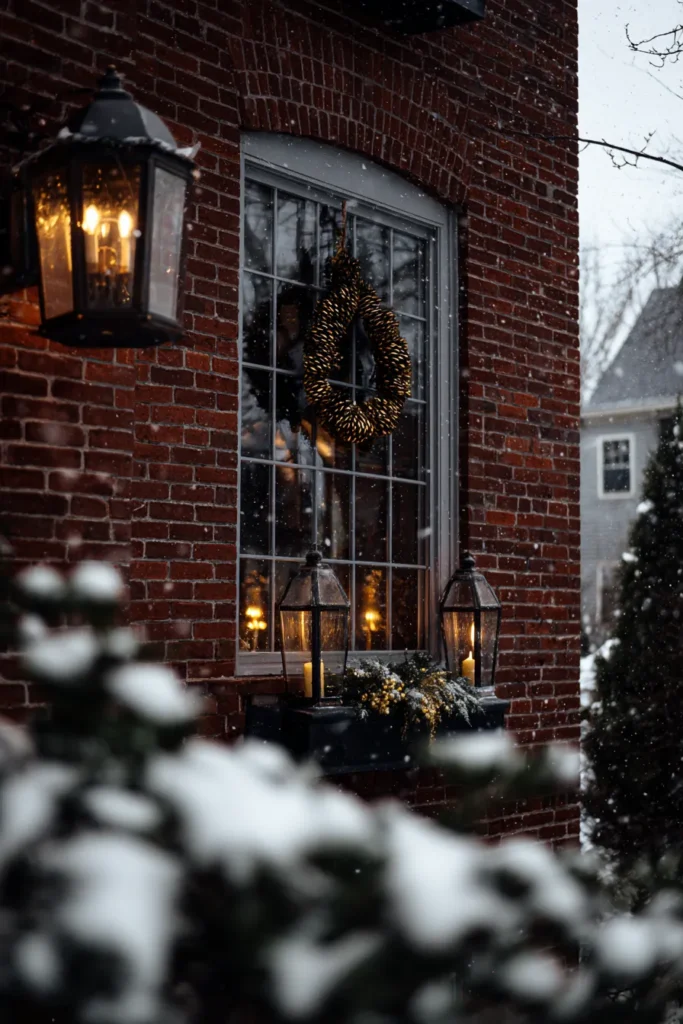 This charming brick home window captures that storybook Christmas feeling perfectly. A gold-toned wreath hangs gracefully against the frosty glass, while warm candlelight flickers from lanterns below, casting soft reflections on the snow. The dark window box filled with evergreens and subtle golden berries ties the whole look together, making the window glow gently against the cold winter evening.