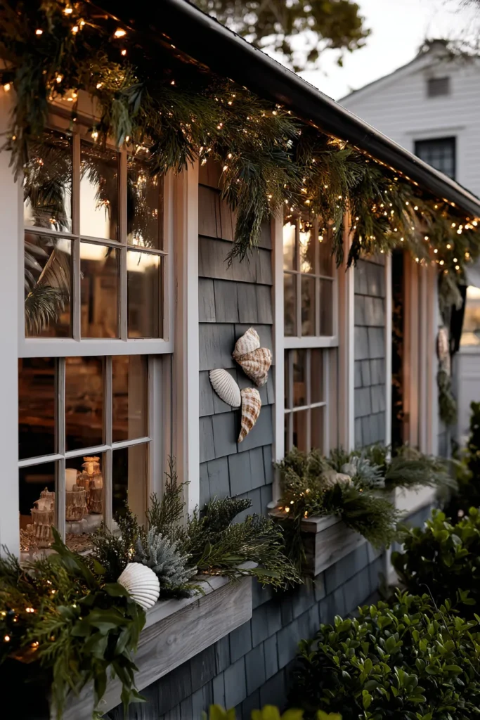 This charming coastal cottage takes a seaside approach to Christmas decor with lush greenery, warm twinkle lights, and a playful touch of seashells. The soft gray shingles pair beautifully with the white-trimmed windows, each framed by garlands that feel both natural and festive. The window boxes are filled with frosted pine, leafy greens, and a few coastal-inspired accents, giving the space a breezy yet cozy glow that fits perfectly with beachside living.