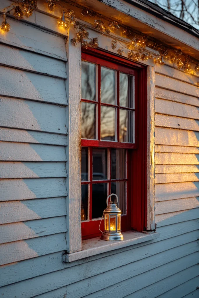 This charming cottage window keeps things understated yet full of character. The bold red trim adds a cheerful pop of color against the pale siding, while a single lantern sits on the sill, casting a soft golden glow. A strand of twinkle lights above adds a warm shimmer that plays beautifully with the setting sun. It’s the kind of minimal Christmas decor that feels timeless, cozy, and effortlessly sweet.
