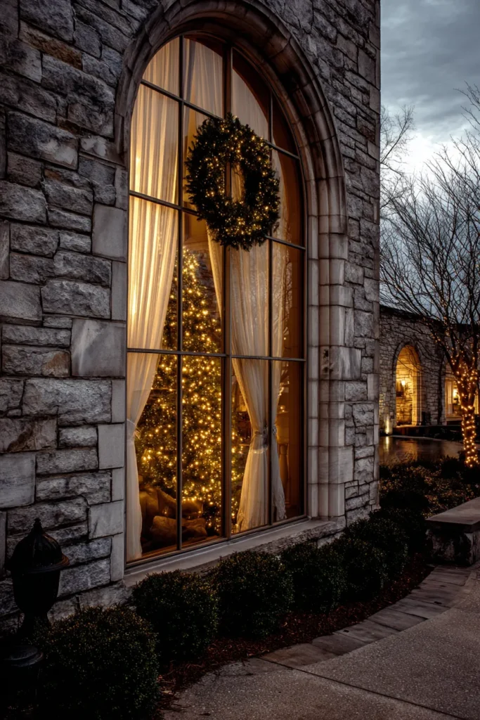 This breathtaking stone house features a tall arched window that feels like it belongs in a holiday movie. Behind the soft white curtains, a beautifully lit Christmas tree sparkles from top to bottom, filling the space with golden light. A lush wreath hangs gracefully above, tying the scene together in the most elegant way. The mix of warm glow against the cool stone exterior creates a perfect balance of grandeur and coziness.