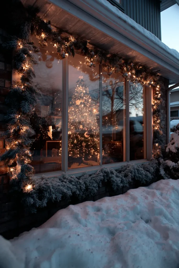 This cozy winter scene captures everything I love about Christmas charm. A frosted garland wrapped in warm fairy lights frames a wide bay window, drawing all eyes to the glowing Christmas tree inside. The soft snow outside adds to the magic, reflecting the golden lights from within. The mix of twinkling bulbs, natural greenery, and that perfect winter blue hour creates a scene that feels both cinematic and homey.