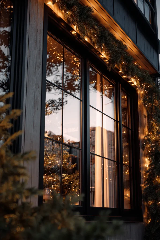 This window design is the definition of quiet elegance. The sleek black frame adds a modern touch while soft golden lights wrap around lush evergreen garlands, creating a warm, inviting glow. Inside, the twinkle of a Christmas tree reflects beautifully on the glass, giving the whole space that layered, luminous look that feels effortlessly festive. It’s minimal yet full of charm, the kind of decor that looks just as stunning from the street as it does from the sofa.
