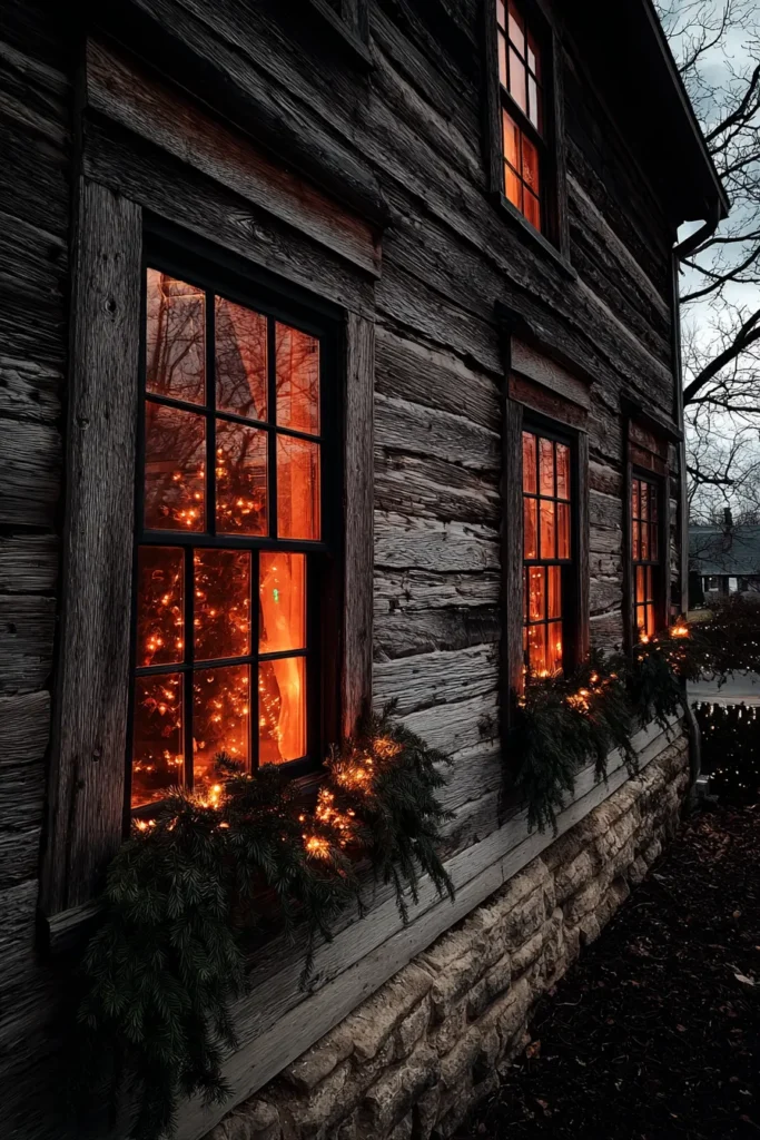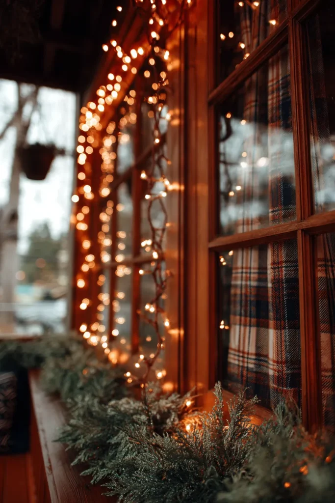 This cozy cabin window setup is the definition of rustic holiday charm. The wooden frames glow softly from strands of warm fairy lights, while a touch of frosted greenery adds a wintry feel to the sill. Behind the glass, plaid curtains bring that extra layer of hominess, making the whole space feel like it’s wrapped in a soft blanket. The lights reflect beautifully on the wood, giving everything a gentle golden hue that feels timeless and inviting.