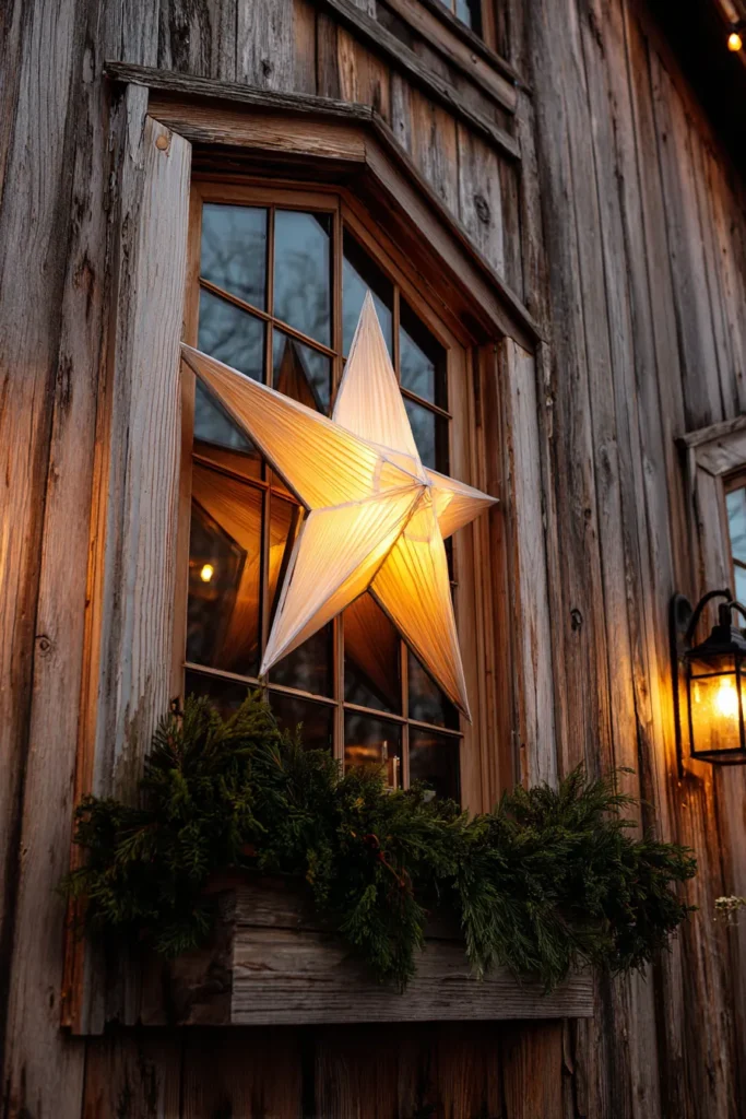 This rustic-style window feels straight out of a countryside Christmas postcard. The weathered wood siding adds warmth and character, while the illuminated paper star steals the spotlight with its gentle golden glow. Below it, a window box filled with lush evergreens adds texture and life, perfectly complementing the cozy outdoor lantern nearby. The overall look is simple yet full of soul, radiating that nostalgic charm only rustic holiday decor can capture.