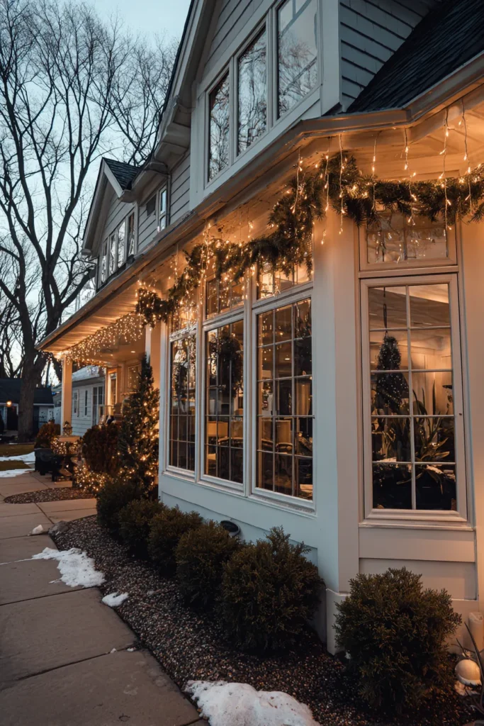 I love how the soft glow from twinkling lights or a simple garland can make a house look so warm and inviting, even from down the street.