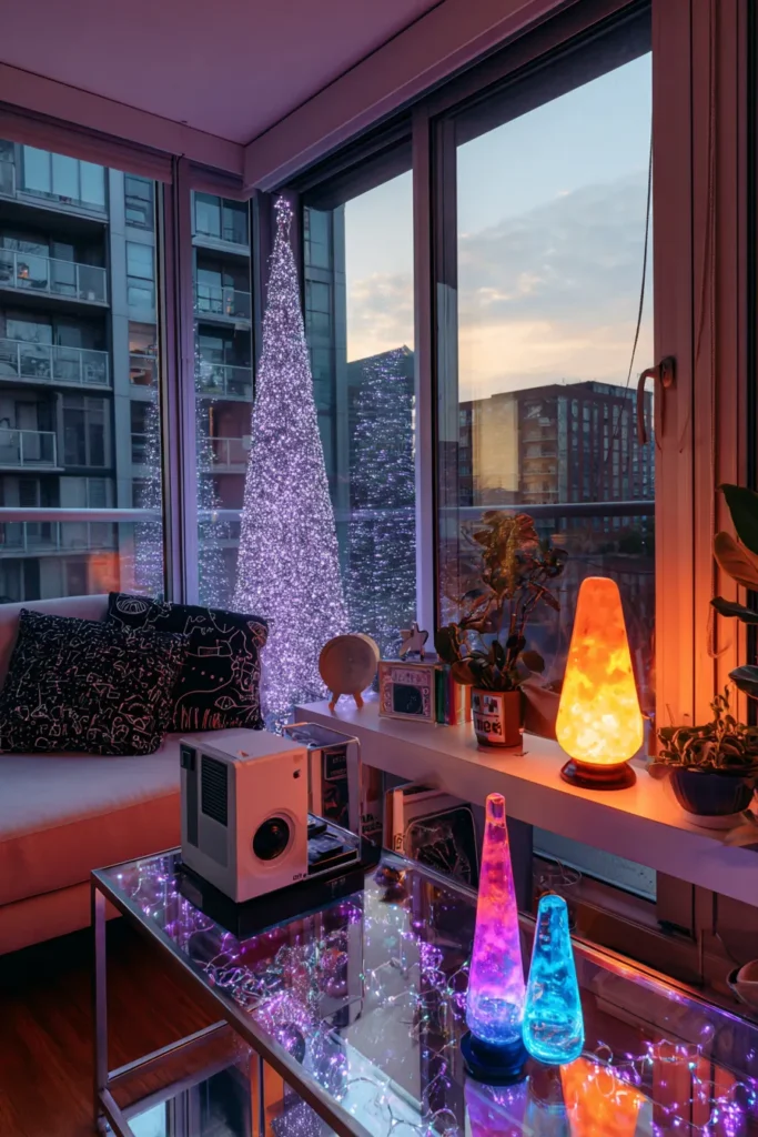 This Y2K-inspired living space feels like stepping straight into a dreamy mix of retro and futuristic vibes. A shimmering purple LED Christmas tree lights up the corner of the room, reflecting beautifully off the glass walls and the city skyline beyond. On the coffee table, colorful lava lamps glow in pink and blue hues, while fairy lights twist around the mirrored surface, giving the whole space that perfect mix of cozy and cosmic. The pops of neon lighting, quirky decor accents, and clean modern lines make the entire setup feel effortlessly cool and full of personality.