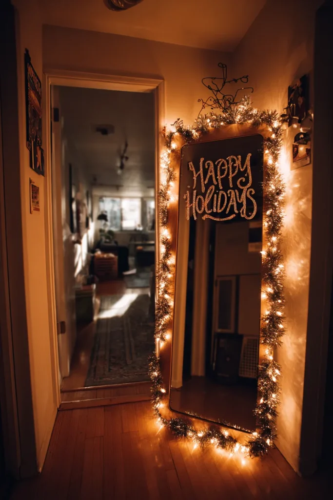 This design proves that even the simplest hallway can turn into a cozy Y2K holiday nook with the right sparkle. A full-length mirror gets a glam makeover with silver tinsel garland and warm fairy lights wrapped around its frame, glowing softly against the walls. The glittery “Happy Holidays” sign on top adds a playful retro flair that feels right at home with the nostalgic Y2K vibe. The soft golden light creates that perfect contrast between festive cheer and laid-back comfort, making this corner feel instantly welcoming and stylish.