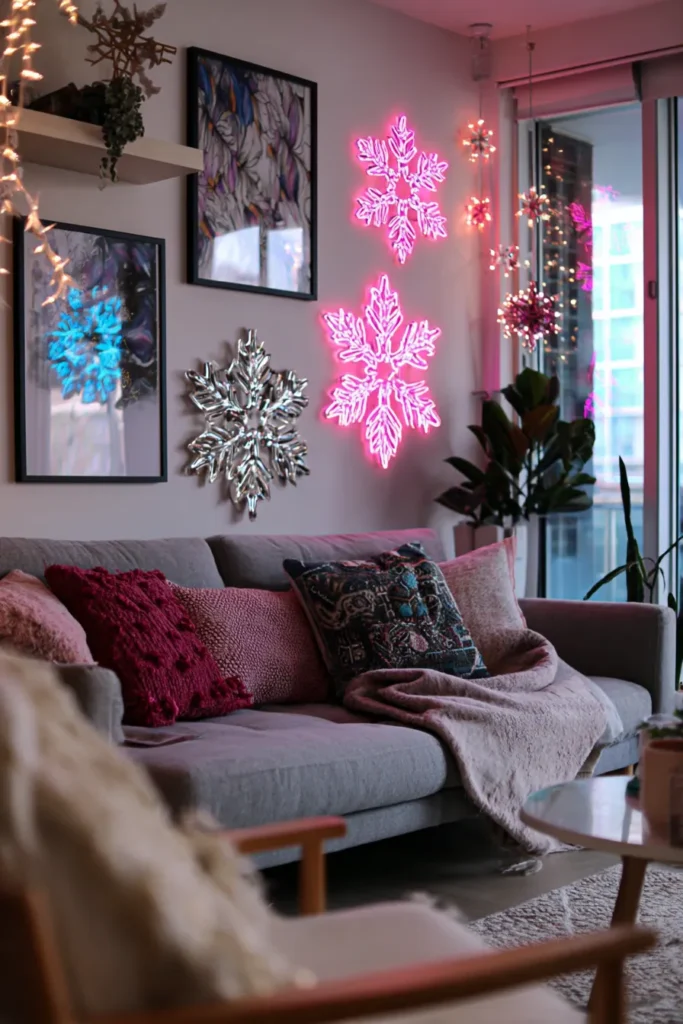 I can’t get enough of how playful this setup feels. Those neon snowflakes are giving total early-2000s energy in the best way, like a mix between a cozy lounge and a cool downtown loft. I love how the glow bounces off the metallic accents and makes the room feel alive even after dark. It’s bold, fun, and just the right amount of extra for anyone who wants their Christmas decor to make a statement.
