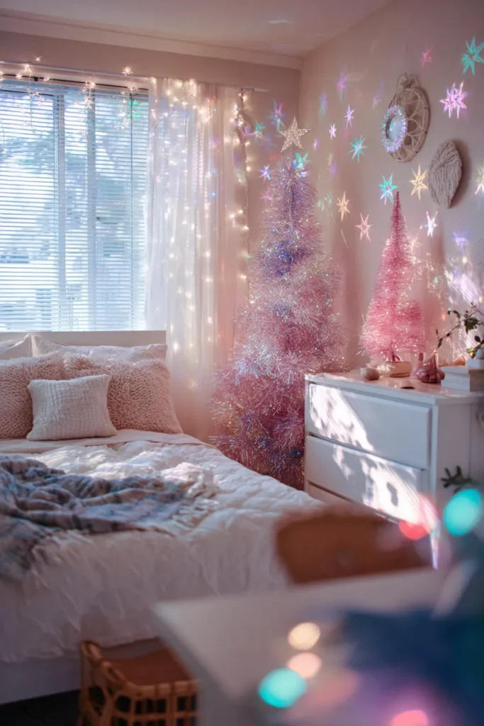 This pastel-perfect bedroom feels like waking up inside a dream. Soft pink tinsel trees shimmer by the window, catching the glow of fairy lights that twinkle through sheer curtains. The bedding is plush and inviting, layered in whites and blush tones that make the whole room feel like a cozy cloud. The iridescent light reflections on the wall add a playful Y2K touch, turning the space into a mix of nostalgia and magic. It’s sweet, sparkly, and totally serene.