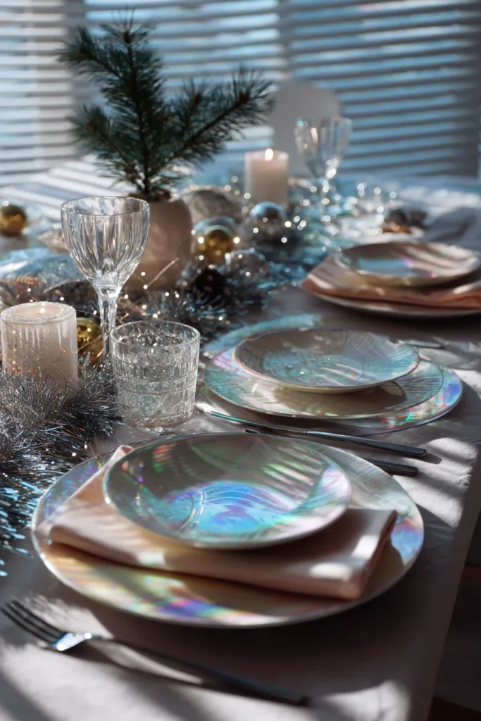 This dining setup captures that perfect Y2K shimmer with a glowy, futuristic twist. The holographic dinner plates catch every bit of sunlight, casting rainbow reflections across the table like little prisms. Silver tinsel garland runs down the center with soft fairy lights, crystal glassware, and a few gold ornaments for contrast. A simple pine sprig centerpiece and white candles add a cozy touch to balance out all that shine. It’s elegant, festive, and delightfully over the top in the best way.