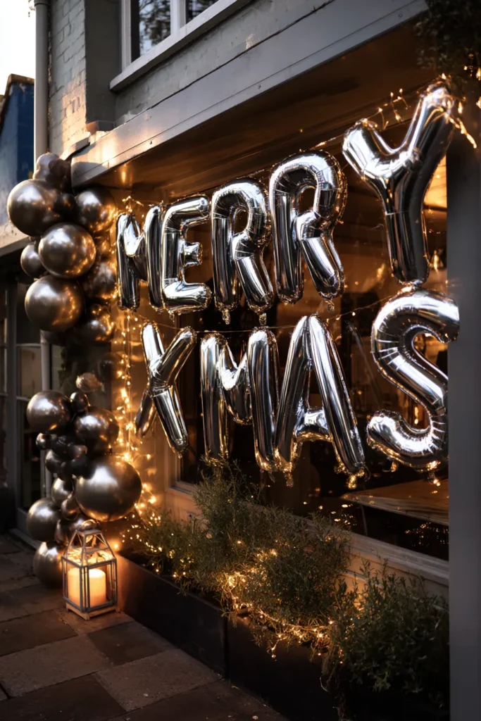 This setup gives classic Christmas decor a bold Y2K remix. Giant silver balloons spelling out “MERRY XMAS” take center stage, surrounded by clusters of metallic balloons that shimmer in the soft glow of fairy lights. A lantern candle adds a cozy touch at the base, grounding all that glam with a warm golden glow. The whole look feels like a holiday party waiting to happen, perfectly blending sparkle, shine, and a little bit of cheeky fun.