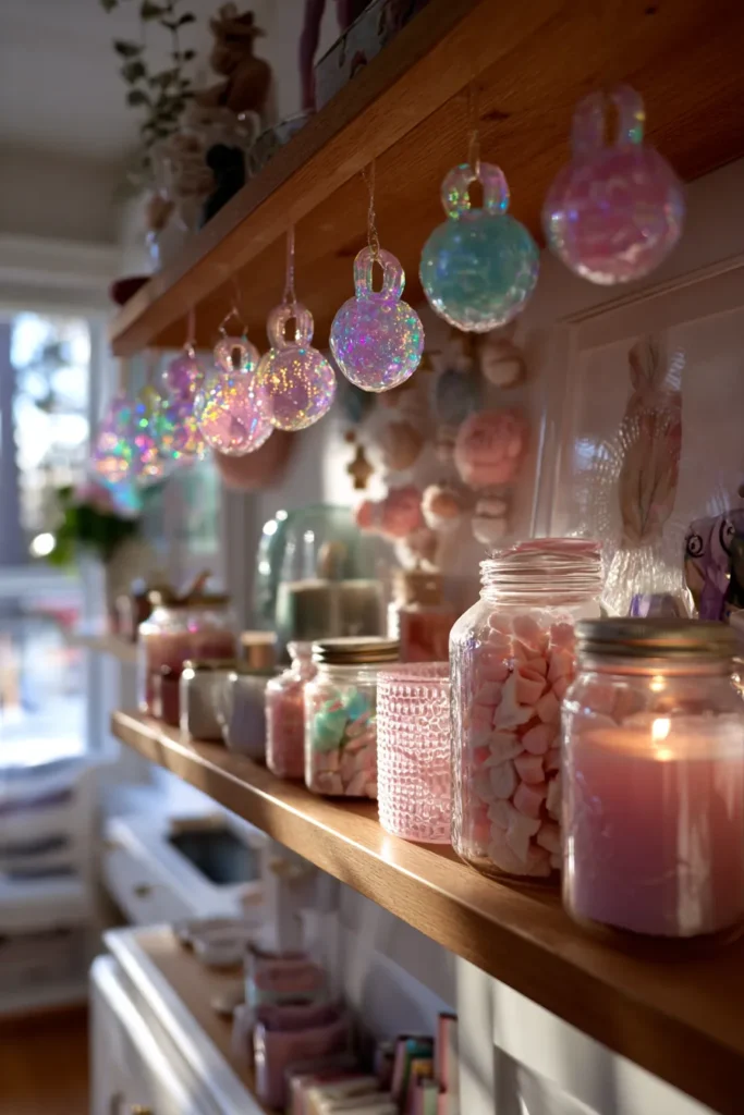 This pastel-filled setup feels like a sweet little corner straight out of a Y2K daydream. Shimmery glass ornaments in soft pink, lilac, and aqua hang neatly under a wooden shelf, catching the light like candy bubbles. The shelves below are lined with jars filled with pastel treats, candles, and trinkets that all play beautifully together in the glow of the afternoon sun. The mix of textures—from glass and wax to soft cotton accents—creates that perfect balance of cozy and sparkly that makes this space feel oh-so-magical.
