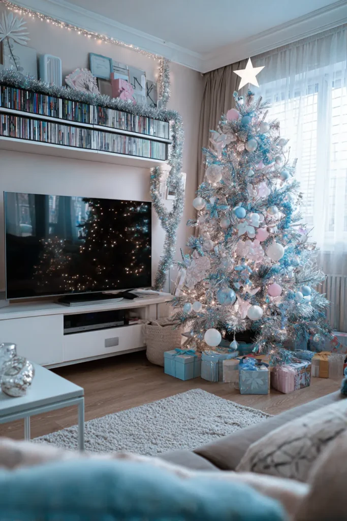 This living room feels like a nostalgic Y2K winter dream wrapped in tinsel and pastel shimmer. The Christmas tree sparkles in silver and icy blue tones, layered with oversized ornaments, bows, and fairy lights that reflect perfectly off its metallic branches. Around the base, pastel gift boxes in pink and aqua add a playful touch that ties everything together. The garland around the shelf and the glow from the fairy lights make the whole space feel bright, airy, and festive in the most effortlessly chic way.