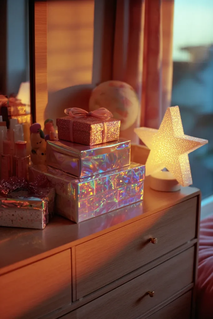 This cozy little corner feels like a love letter to Y2K glam. A stack of holographic and glitter-wrapped gifts catches the sunset light, scattering dreamy rainbow reflections across the wooden dresser. Next to them, a glowing star lamp adds that perfect soft shimmer that ties the whole look together. The pastel tones, warm glow, and iridescent textures give this space such a nostalgic yet effortlessly modern holiday vibe.